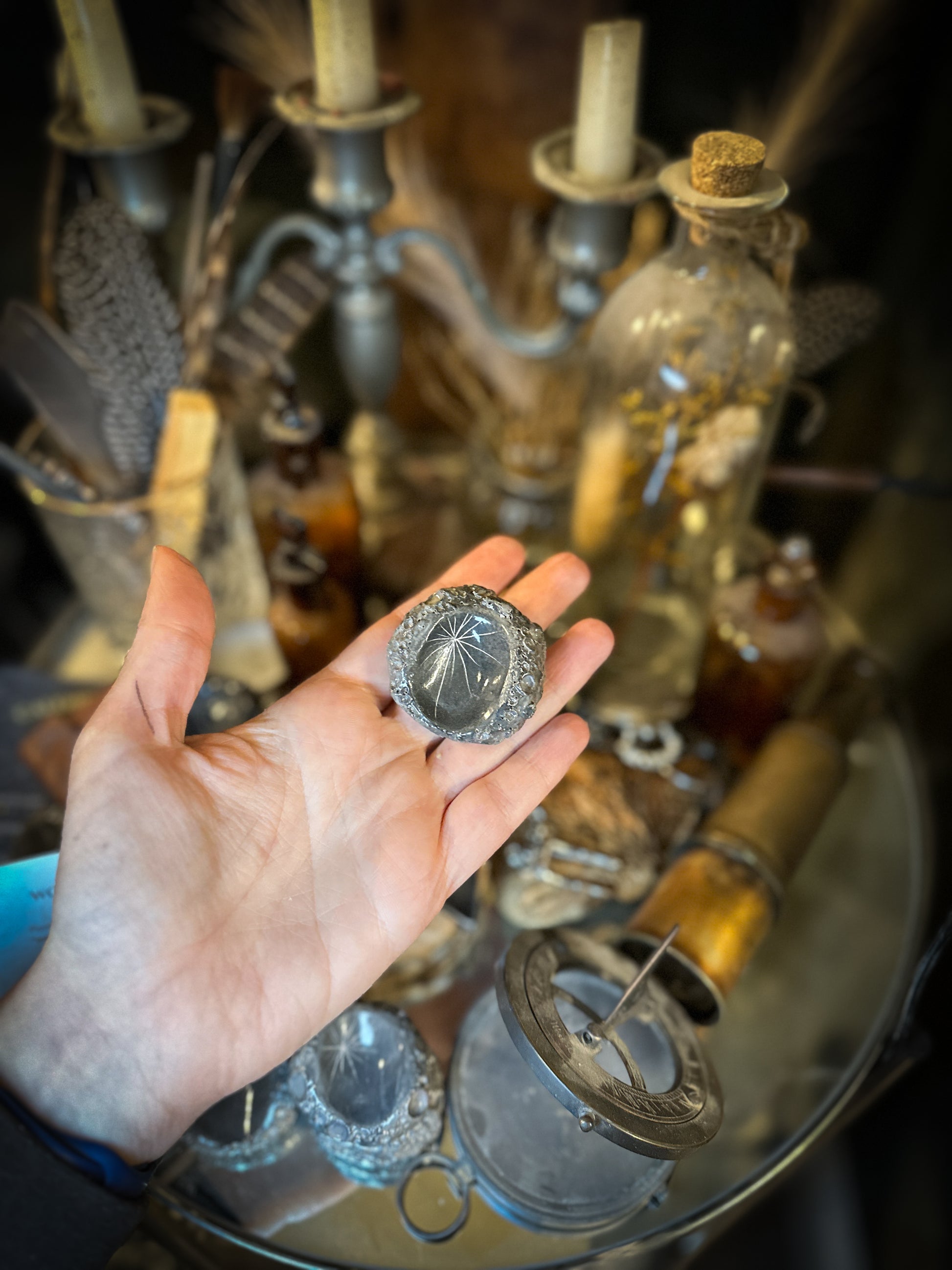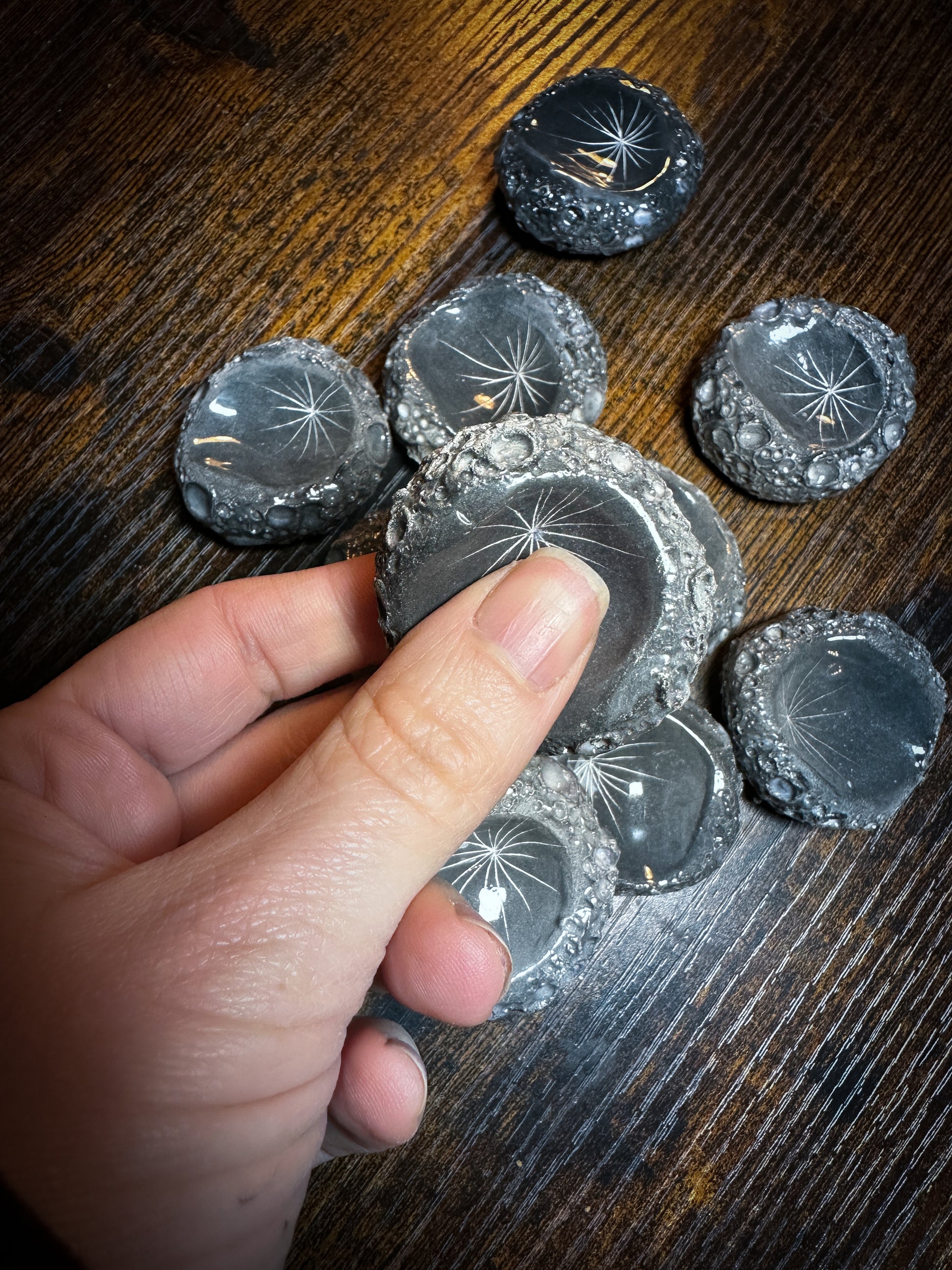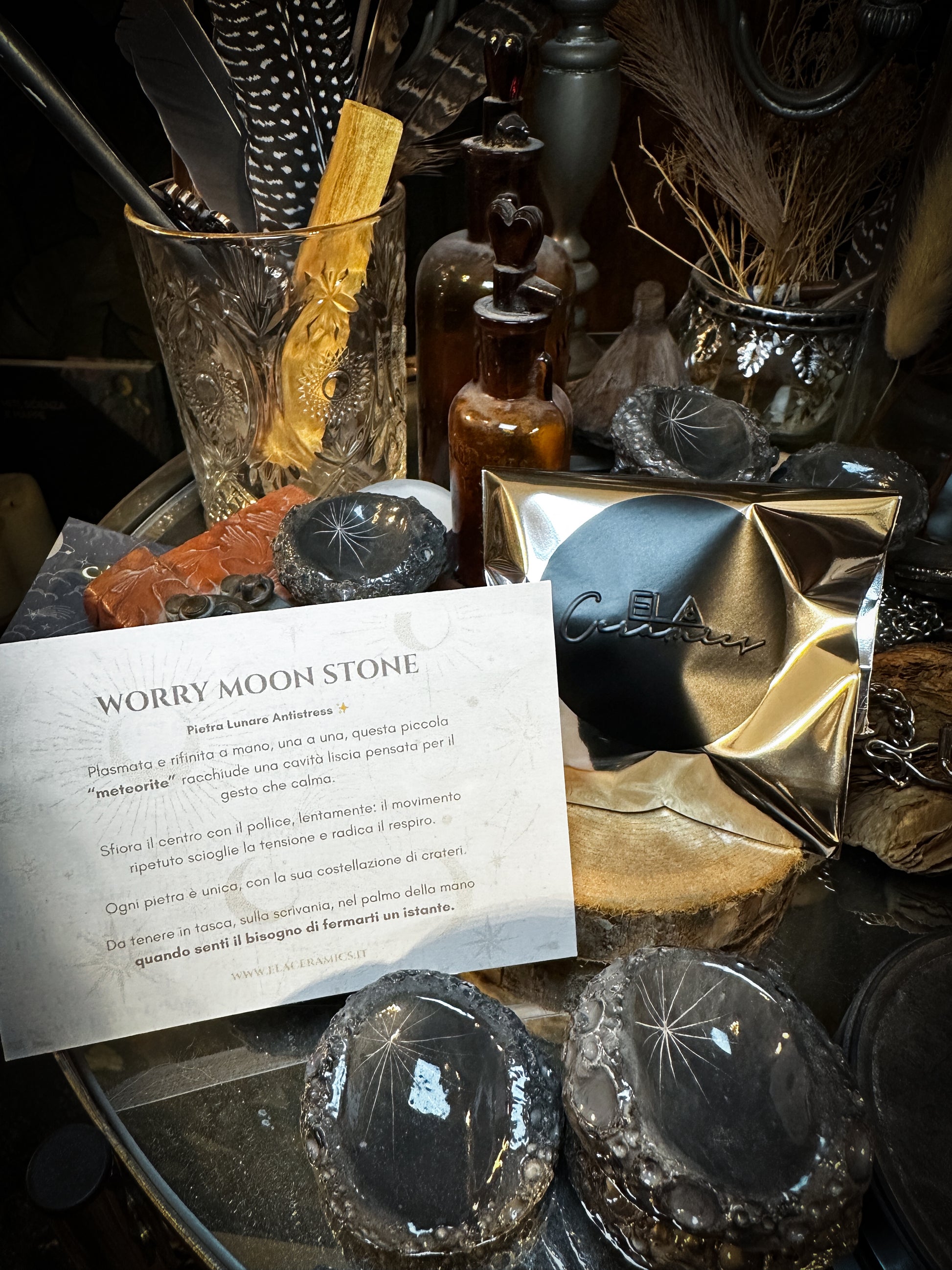 La Worry Moon Stone è modellata a mano una per una nel mio laboratorio: ogni pezzo nasce da nodi di argilla plasmati, incisi, scavati e levigati fino a trasformarsi in una micro-meteorite da tenere tra le dita.