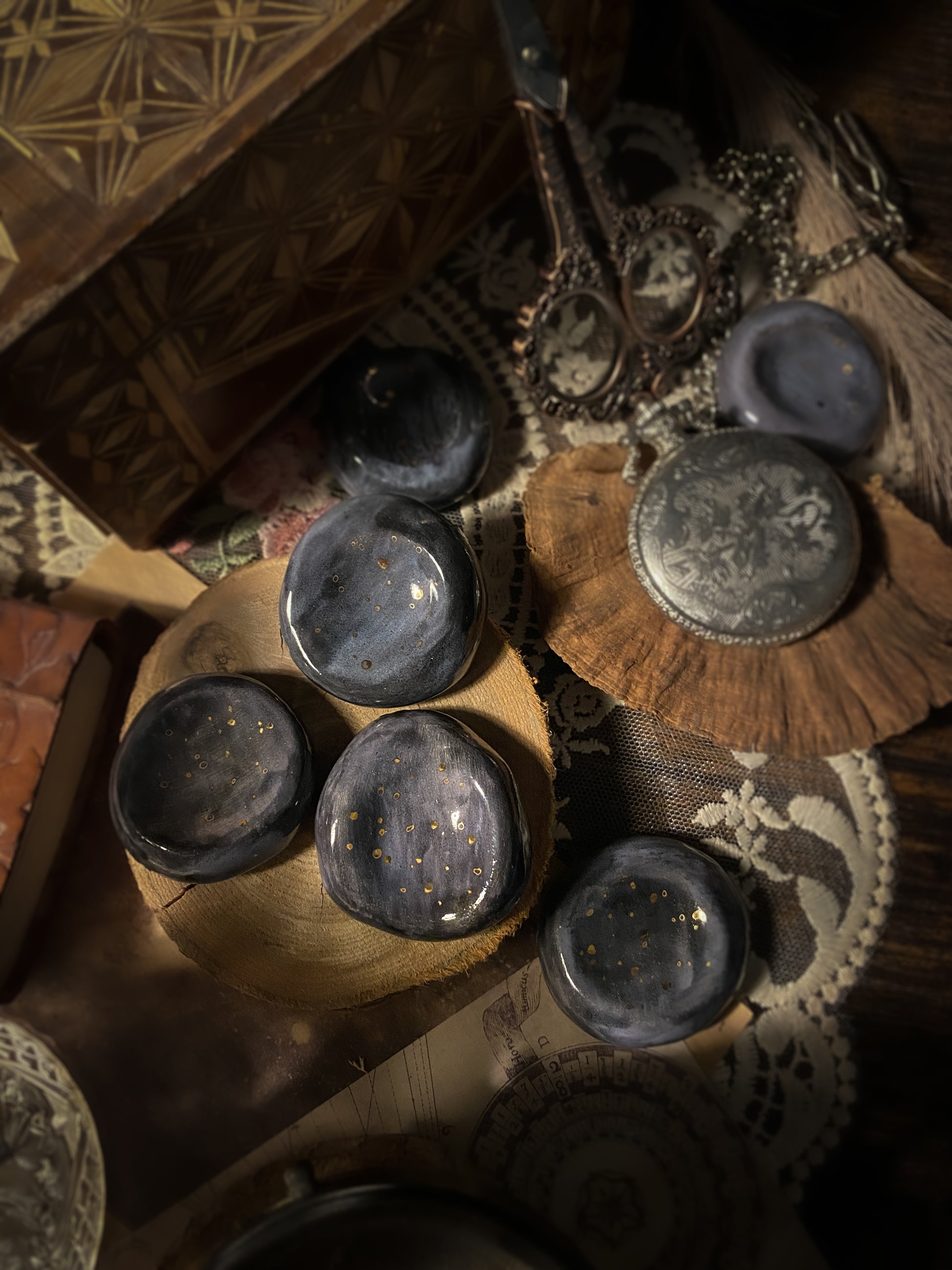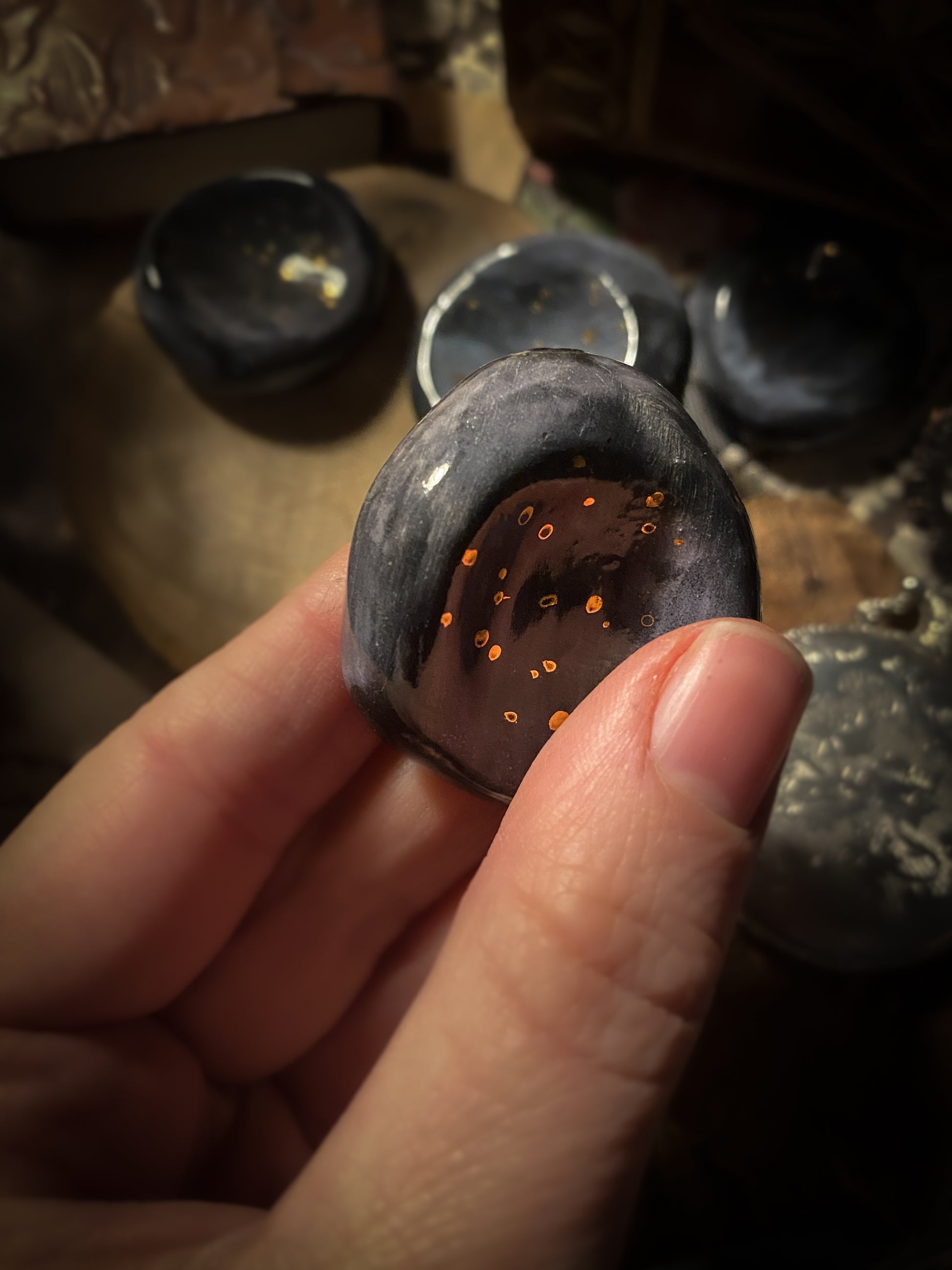 La Worry Sky Stone è modellata a mano una per una nel mio laboratorio: un disco morbido di ceramica, nato da velature scure, venature velate e minuscoli punti dorati che ricordano un frammento di notte stellata.